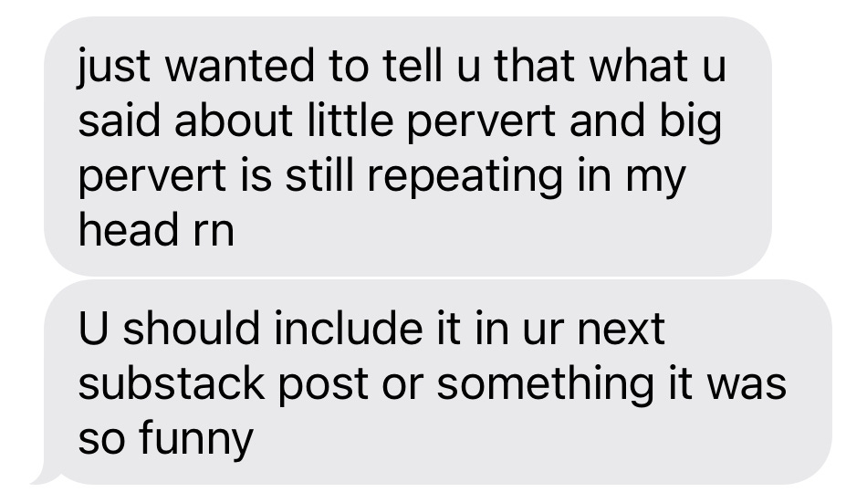 Two perverts live inside of us. Little Pervert and Big Pervert. Little Pervert is “don’t worry if not,” incarnate, applying caution and safe logic as an effort to disarm your desire. When Little Pervert possesses you, you send a shy text or you don’t text at all, but Big Pervert is made of the stuff that our social world is currently deprived of. Big Pervert is more robust and forward. Big Pervert asks for a number. Big Pervert says someone looks good to their face. Big Pervert acts, Little Pervert wants to keep you in an armchair. When Big Pervert possesses you, you're able to get your answers much quicker than Little Pervert’s fear could ever allow. Little Pervert loves limbo. Big Pervert introduces you to reality.