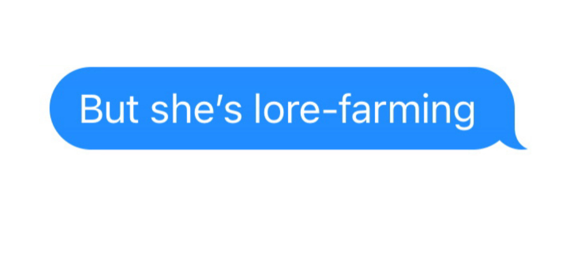 I think a lot of younger people, especially in the internet age, make choices subconsciously for the sake of their lore. I think I’m going to start to call this behavior ‘lore-farming’. I see it everywhere: bad choices for the sake of a story or some type of thinly veiled texture. I’m sure I’m guilty of it in one way or another, but it feels odd to leave this notion unnamed.
